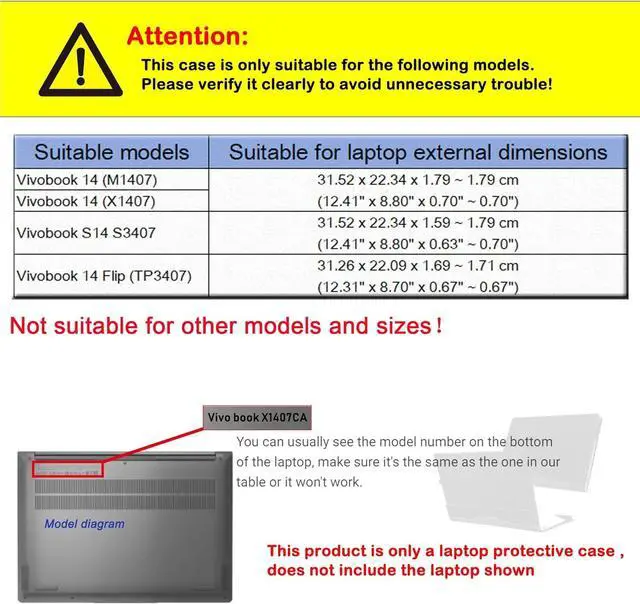 Fit Models: Only for ASUS Vivobook 14 (M1407 /X1407) & for Vivobook S14 S3407 & for Vivobook14 Flip TP3407,not fit for any other models, Be sure to check that the external dimensions and model number of your laptop are the same as those shown in our pictures.