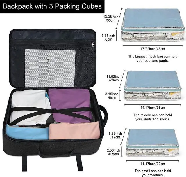MULTIFUNCTIONAL- This large capacity backpack come with 3packing cubes, which are great for organizing your clothes when packing for a trip. This backpack could also served as travel laptop backpack, carry-on luggage, business laptop backpack, overnight bag, camping rucksack, school bag, hiking backpack, gym backpack, large college bag, casual day pack as well. The travel backpack for men can easily hold your all essentials, satisfy all your need in one bag!