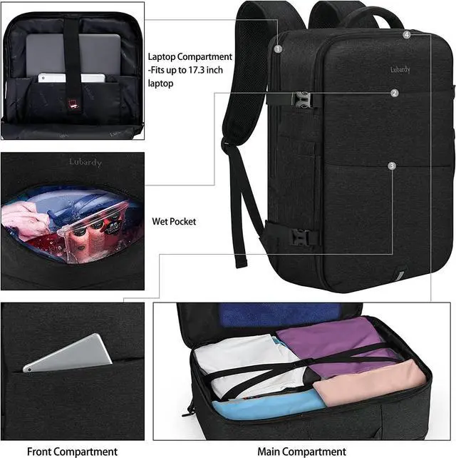 FILGHT APPROVED CARRY-ON LUGGAGE- This luggage backpack meet the allowed maximum size of most IATA flights and also fits in the overhead compartment and the underseat in flight. The portable opening facilitates of this backpack could help to quickly pass the airport security check. It also has built-in elastic bands to keep your clothes from falling out. The side handle and adjustable buckles in both side could great to for flight travel.