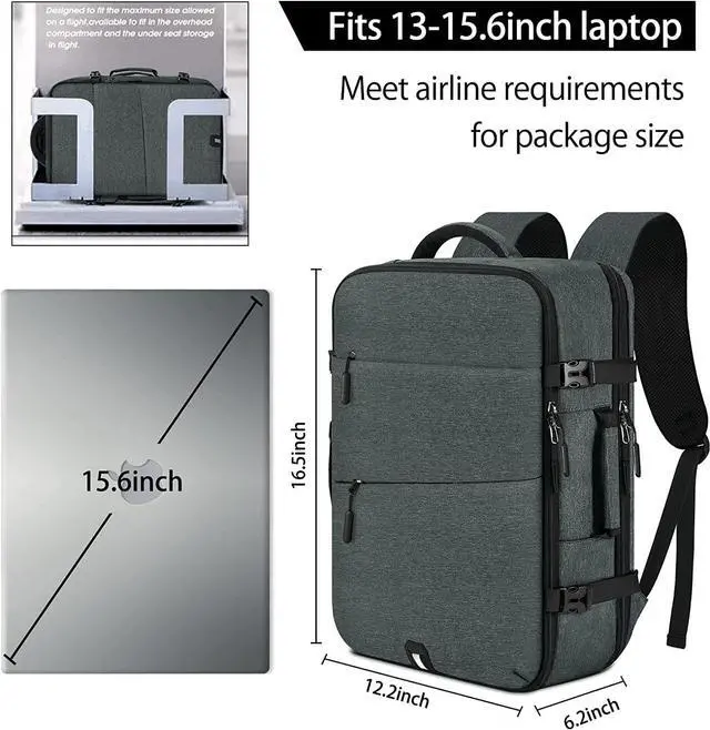 Flight Approved Travel BackpackSize of travel backpack: 16.5 * 12.2 * 6.2 inches. This carry on backpack is meet the allowed maximum size of most IATA flights and also fits the overhead compartment and the underseat in flight. The TSA laptop backpack is free to open 180 degrees to help you pass through ariport security check more quickly.