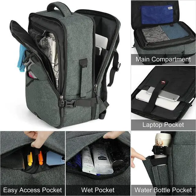 Easy to OrganizerThe luggage backpack with many compartment to store different travel essentials. One main mesh compartment with roomy space to store 3-7days clothes, shoes, etc. One separate laptop compartment holds laptop up to 15.6 inches. One wet pocket for toiletries and wet items. One front pocket with various pockets for storing pens, keys, earphones and other small items. One side pocket for easy access to your water bottle or umbrella.
