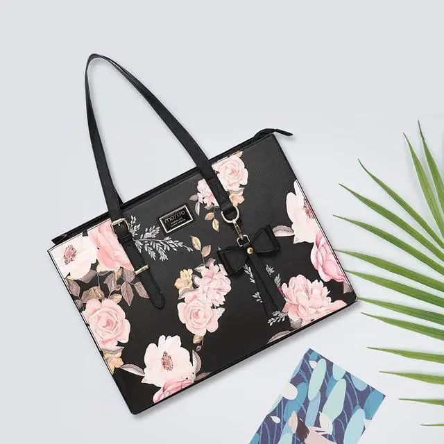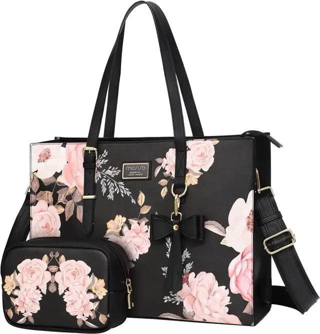 MOSISO Laptop Tote Bag Compatible with MacBook Pro 16 inch 2022 2021 M1 A2485/2019-2020 A2141&15-15.6 inch Notebook, Peony PU Leather Travel Work Briefcase with Detachable Bowknot & Small Purse, Black
