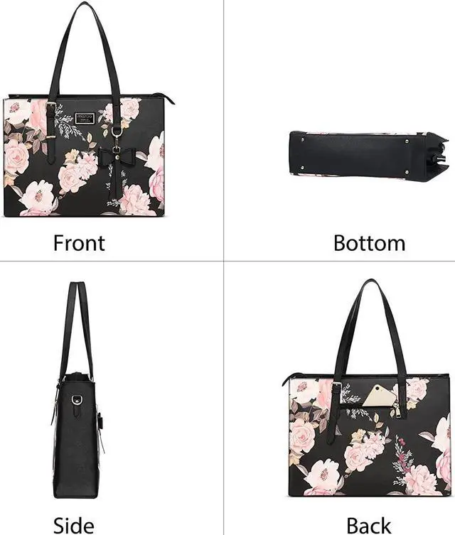 Roomy enough with 3 compartments for all your daily stuff. The computer compartment in the middle provides a thick padded foam section with a hook & loop strap closure for your laptop or tablet. Professional design to protect your laptop against accidental impacts and scratches. The other two side compartments & matching color small pocuh case can store your jewelry, mobile phone, book, keys, mouse, passports, credit cards, cash, makeups and so on.