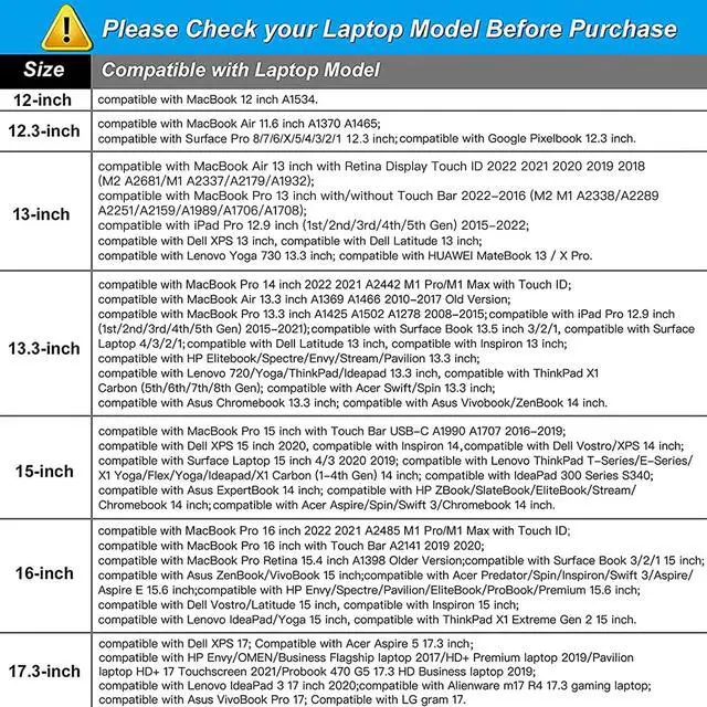 Compatible with MacBook Pro 15 inch with Touch Bar USB-C A1990 A1707 2016-2019; Compatible with Surface Laptop 4/3; Compatible with Dell XPS 15 & Vostro/XPS/Chromebook 14; Compatible with Acer Spin 3, compatible with Acer Aspire 1 Cloudbook, compatible with Acer Swift 3 14; Compatible with Lenovo ThinkPad X1 Yoga / X1 Carbon (1-4th Gen), compatible with Lenovo ThinkPad T-Series/E-Series/Ideapad/Flex/Yoga 14; Compatible with HP Probook/Pavilion/ZBook/SlateBook/EliteBook/Stream/Chromebook 14.