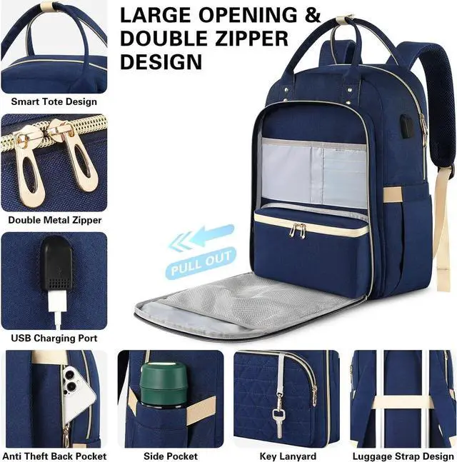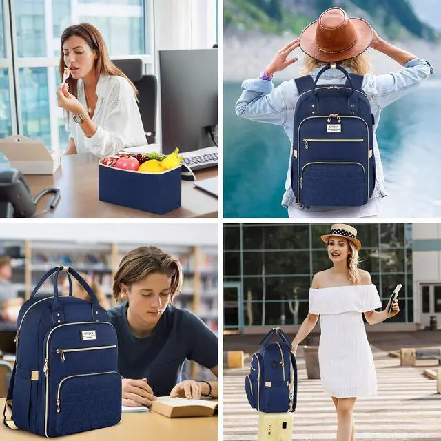 Durable & ComfortableThis work backpack is made of durable polyester fabric, and the double metal zipper is easier to open / close, and it will not tear. Tote package handle design makes you carry it easier. The shoulder strap is made of breathable sponge, and it is wide enough, even if it is used in summer, will not let you feel sultry and exhaustion. This lunch backpack is perfect work, travel, and daily use.