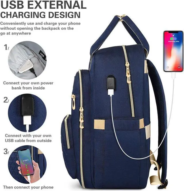 USB Charging Port Design On both sides of the travel backpack, we designed USB plugs and anti-theft pockets. You can easily connect your mobile phone to USB port, charge anytime, anywhere. In order to let you quickly find the key and prevent losswe designed keychain function in the front small pocket.