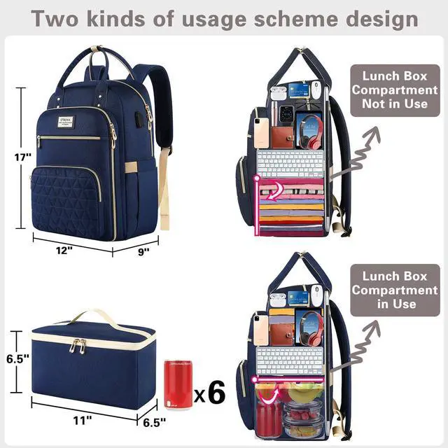Independent Insulation Lunch BagThe laptop backpack includes a detachable insulated lunch bag. The removable waterproof lunch bag is made of easy cleaner aluminum foil and high quality polyester cloth for carry lunch box, fruits, drinks etc. It can keeps the food warm or keeps cooling for about 4-5 hours. Let you enjoy delicious fresh food.
