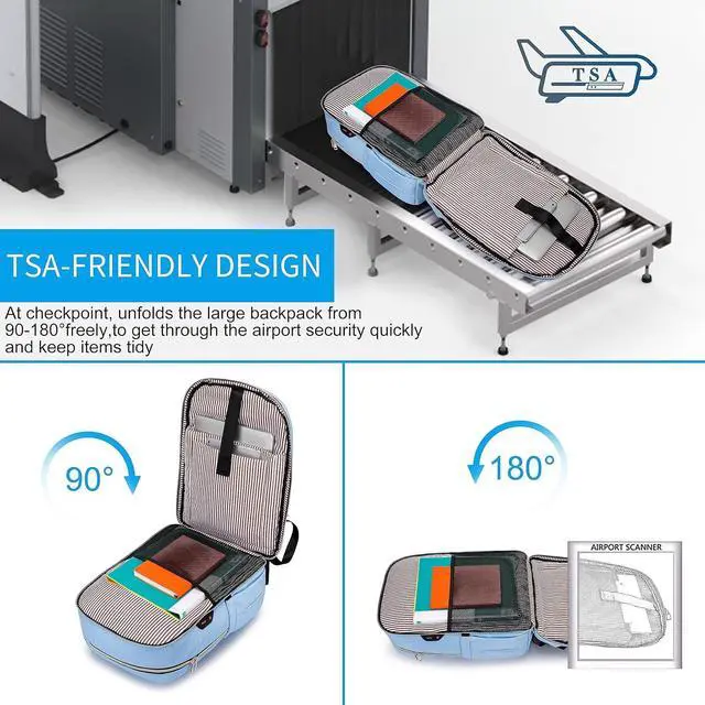 TSA-Design: TSA-Friendly backpack can be easily scanned by security machine. At Checkpoint, unfolds the backpack freely 90-180 degree and the laptop stays flat without taking it from the backpack, making it getting through security checkpoint more efficient.