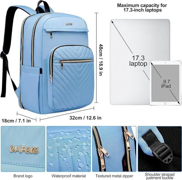 17.3 Inch Larger Capacity & Multi Organized Pockets: Dimension- 12.6L x 7.1W x 18.9H (airline approved), Weight: 1.88 lbs. 35L large capacity, 5 compartments and 20+ pockets, super large capacity for your computer, A4 folder, bottles, umbrellas, clothes, college supplies and travel essentials. Fits up to 17.3 laptop.