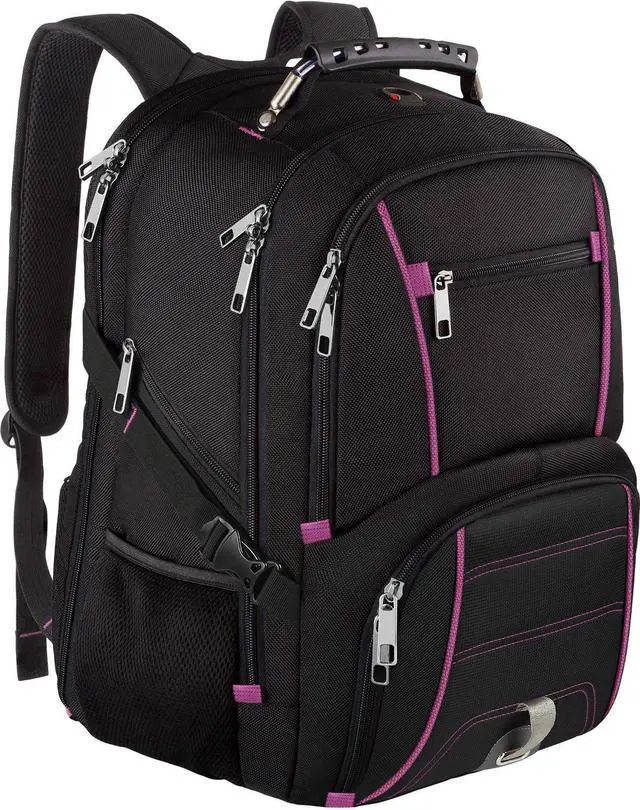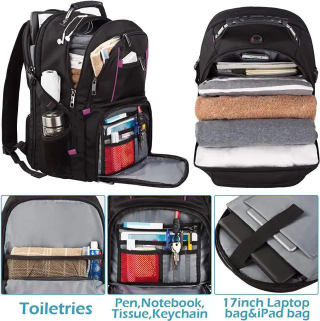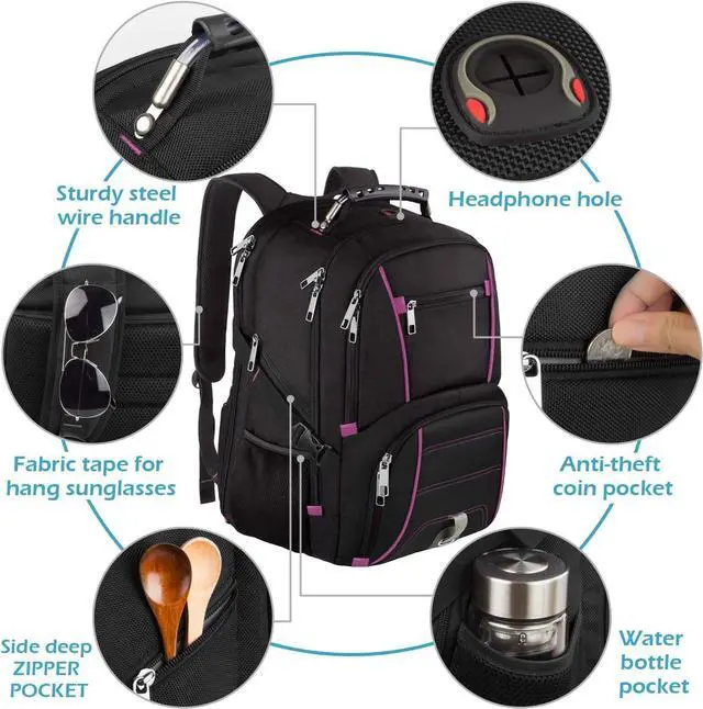 Size: 14.8 * 10.5 * 19.3 (L*W*H). Large capacity 45L with 20+ organizer pockets could meet your various needs. The generous multi-compartment backpack with a padded sleeve for 15.6, 17, 17.3 Inch Laptops/Macbooks/computers for stendents, adults, women and men. Organizational compartments can be used for additional supplies and accessories as iPhone, iPad, pens, keys, wallets, books, textbooks, clothes, passports and cell phone. Mesh water bottle pockets at sides