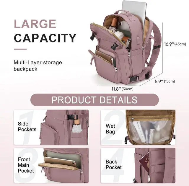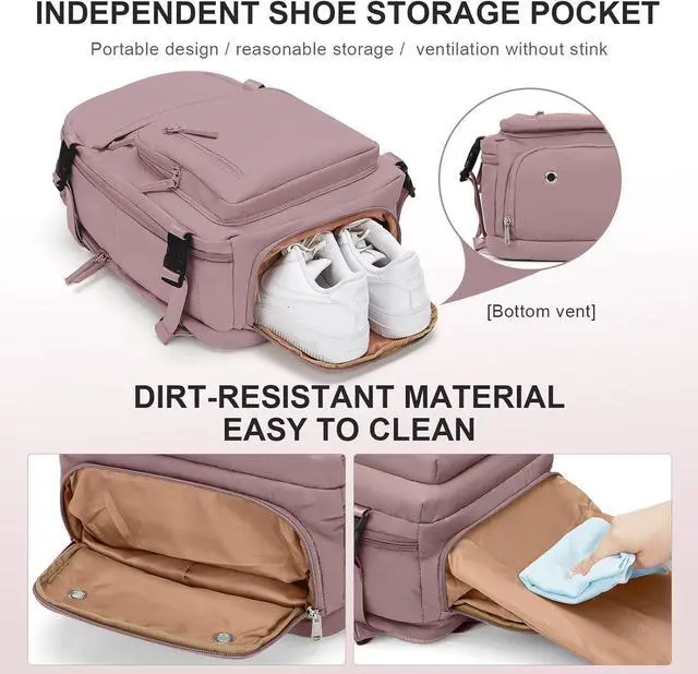 Separate Shoe Compartment Design & Wet BagMain pocket x 2, laptop compartment x 2 (fit for a 13 tablet and 14 laptop respectively), and many other pockets for different purposes. The wet bag is made of high density water resistant material can help you to separate dry items and wet items, if you have wet clothes or towel, you can put it in wet bag. A separate shoe compartment can help you carry and keep your shoes better in your travel bag.