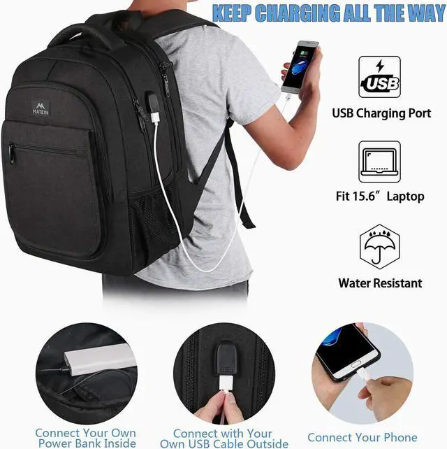 USB Port & Anti-TheftWith built in USB charging cable, the 15.6 inch laptop backpack with usb port offers you a more convenient way to charge your phone while walking around the campus. The Anti Theft backpack have a hidden pocket on the back, can protect your valuable items from being stolen. The shoulder strap with zippered pocket for airline ticket, passport and such. As a men electronics backpack, it's nice tech gifts for men, can use as Valentine's/Mother's/Father's day gift