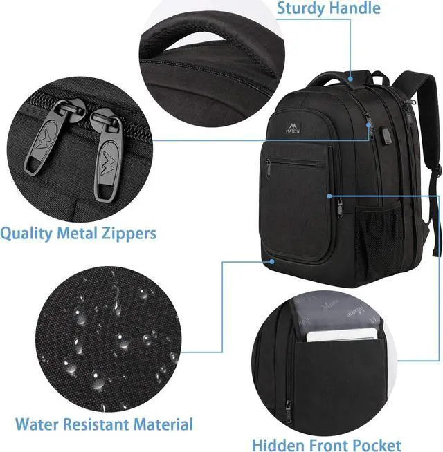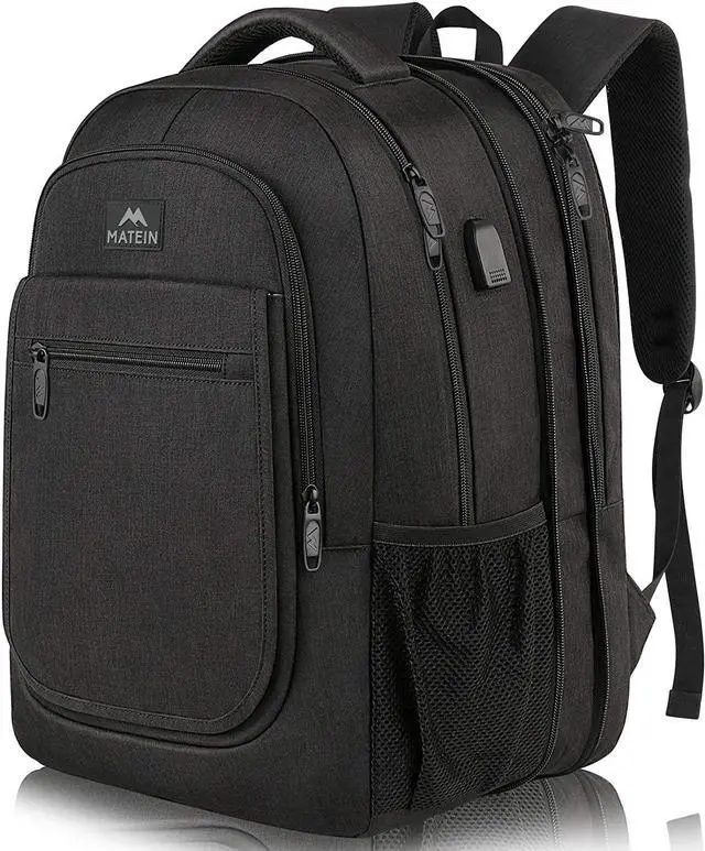 Multiple Pockets & Organized The men's work backpack owns 17+ independent pockets for large storage and organization for small items. 3 spacious main compartments with many hidden pockets can accommodate lots of stuffs like college supplies, travel accessories, clothes, stationery, school books, cord organizer, side deep zipper pocket for easy access essentials, side elastic net pockets conveniently hold umbrellas and water bottles. Ideal book bag backpack for high school student