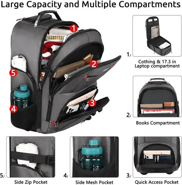 [Multi-Compartment] The rolling laptop bag has a laptop compartment to hold a 17.3 inch laptop, thick foam padding protects your device from damage. Large main compartment roomy to hold clothes and toiletries for a 3-5 day trip. The zippered compartment to organize bulky files. A quick acces pocket to store important items such as wallets, phones, passports. And the side pockets can hold water bottles and umbrellas. These make your items organized and easier to find.