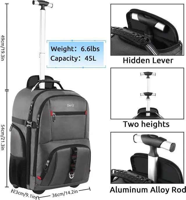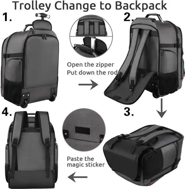 [Travel Backpack & Rolling Duffle Bag] The rolling backpack equipped with aluminum alloy rod, durable rubber wheels and concealable shoulder straps, you can switch between carry on backpack and wheeled backpack at will. When using it as a rolling backpack, you can stow the shoulder straps on the back panel. When using it as a carry on backpack, wheeled backpack has a cover for wheels so the wheel dirt doesnt get on your clothes.