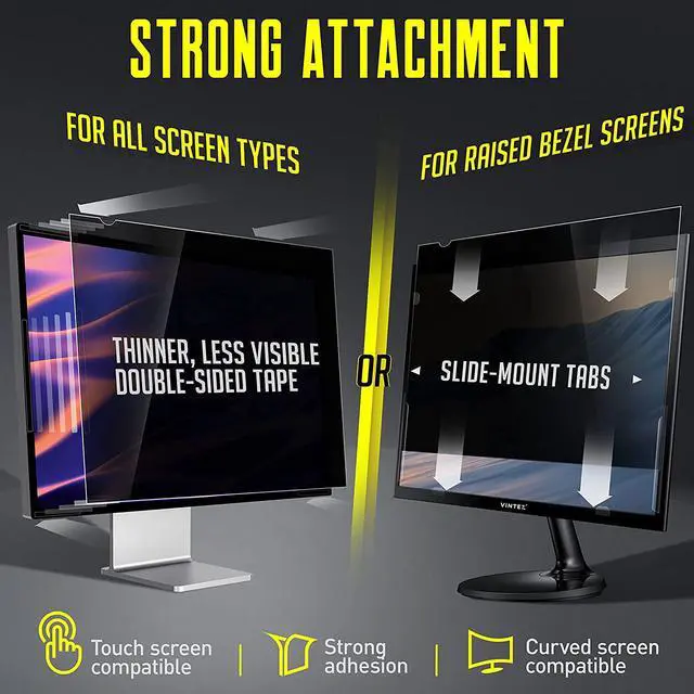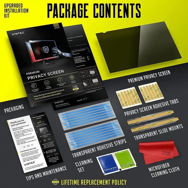 Easy Installation -- Includes two, easy-to-attach options - Attachment strips and Slide-mount tabs. Package contains Extra installation kits. We guarantee all screen filters have 100% quality due to hand checking. Lifetime Replacement Policy Your computer privacy screen is protected under our lifetime replacement policy and if anything happens we will send you a new privacy screen at absolutely no cost. You can relax worry-free, knowing you can rely on the help of Vintez Technologies.