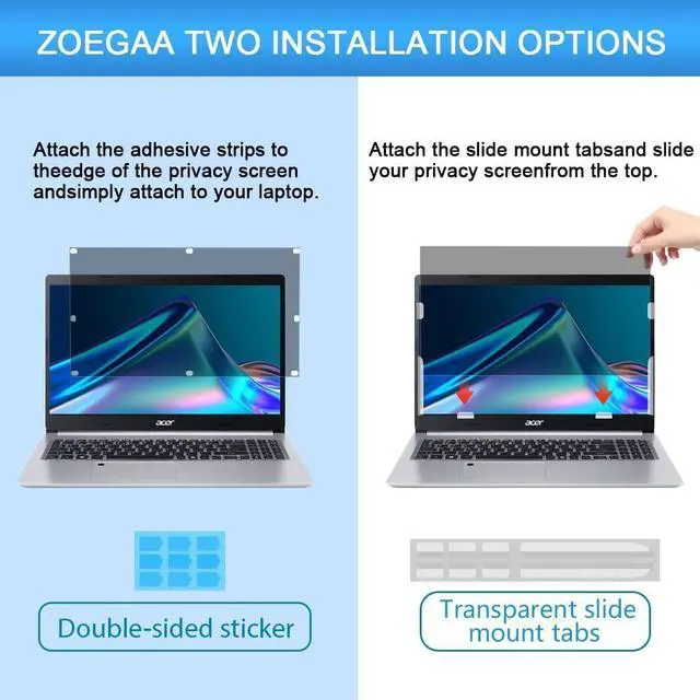 4. Install Options-There are two methods of installation for your laptop Privacy screen filter. Option 1 includes high-quality adhesive strips that can be placed on the outer edges of your Privacy filter, and simply attach to your laptop; Option 2 includes slide mount tabs, that attach your bezel on your laptop, allowing you to easily remove your Privacy filter from your laptop screen when needed. All accessories and installation instructions are included.