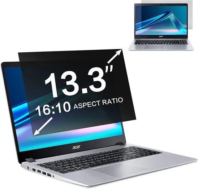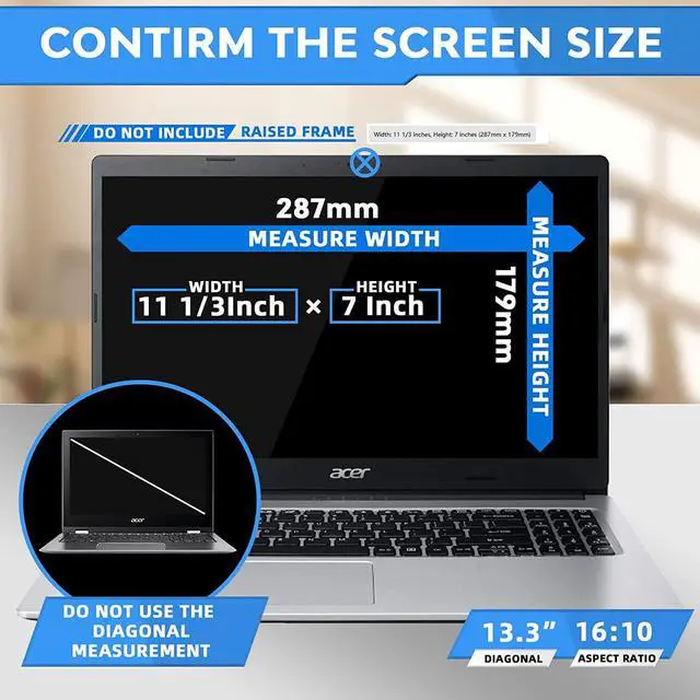 Dimensions- Width: 11 5/16" ( 11.3 inches/287 mm), Height: 7 1/16" ( 7.0 inches/179 mm) - Aspect Ratio 16:10. ZOEGAA Privacy Screen Filter compatible with 13.3 inch 16:10 Widescreen laptop brands. Please verify your computer screen's width and height measurements before ordering. Contact us if you have any questions about dimensions.