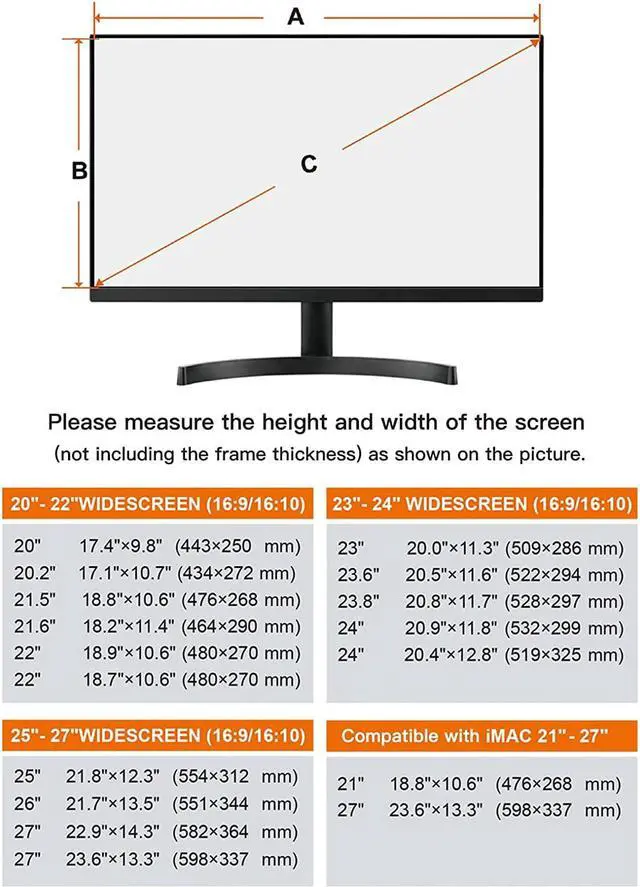 Dimension: 25 x 16.34 inch/L x W. Compatible with Lenovo G25-10 25 inch; compatible with Inspiron 27, compatible with Dell P Series 27/Ultrasharp U2718Q 27; compatible with HP Pavilion/Envy 27/EliteOne 1000 27; compatible with ASUS PB258Q 25/ZenAiO/ROG PG279Q 27; compatible with Acer G276HL Kbix 27; compatible with Samsung 27; compatible with LG 27UK650-W 27 inch and diagonally measured 25, 25.5, 26.5, 27 inch 16:9 widescreen desktop PC LED monitor. Please measure your modiagonal dimension before purchase.