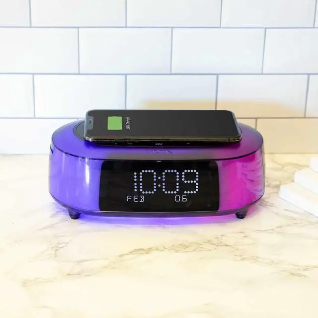 ihome ibtw281 alarm clock radio wake to light bluetooth speaker with color changing and wireless qi fast charging builtin dual alarm digital clock with dimmer, snooze, battery backup and usb charging