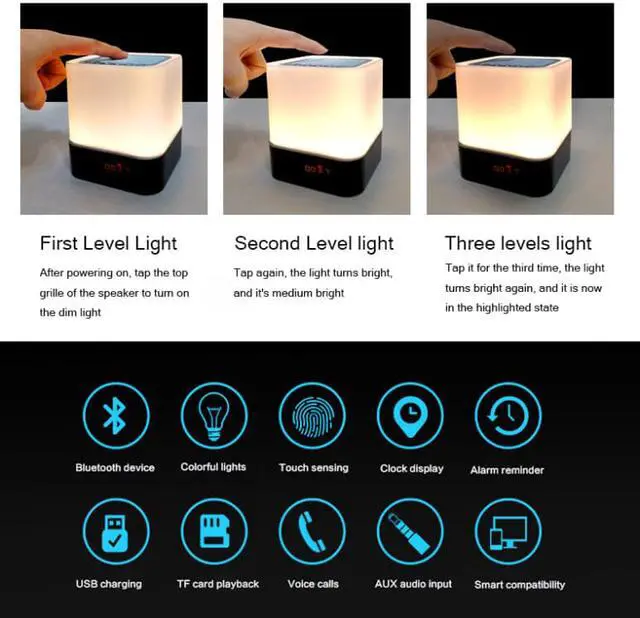 Light Adjustment – one light touch on the top in the middle of the speaker grid turns the light on and subsequent touches level up the brightness then turn it back off.