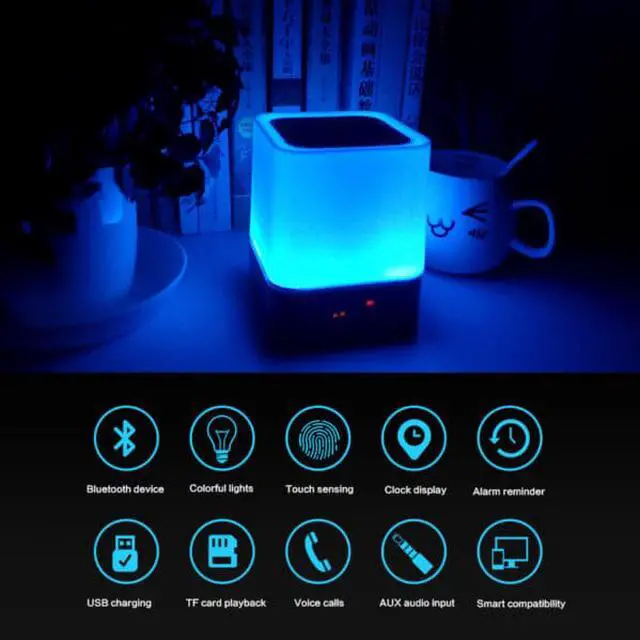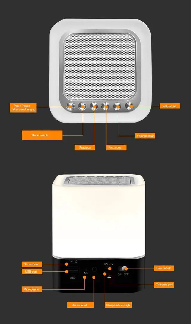 Color Adjustment – hold down your finger briefly (approx. 2 seconds) in the middle of the speaker grid and this will activate the color light. Once activated, single touches will cycle through the various color options. When playing music, the colors will automatically change with the rhythm of the music!