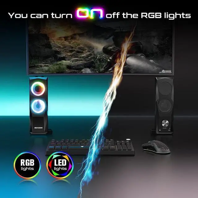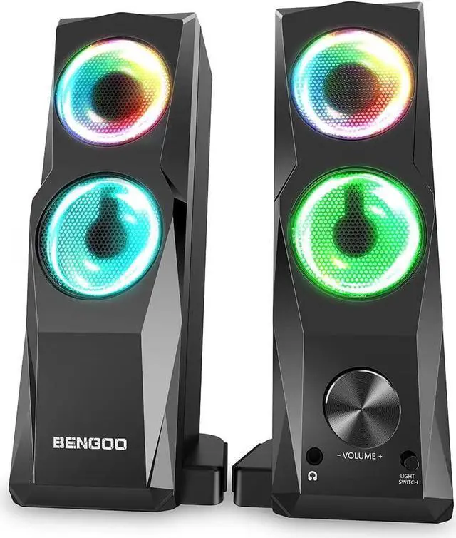 Switch Controllable RGB Lights- BENGOO speakers for PC have nice colorful breathing cycle RGB lights, heightening the atmosphere, when you play games, watch movies, and listen to music. Switching off the light is also available.