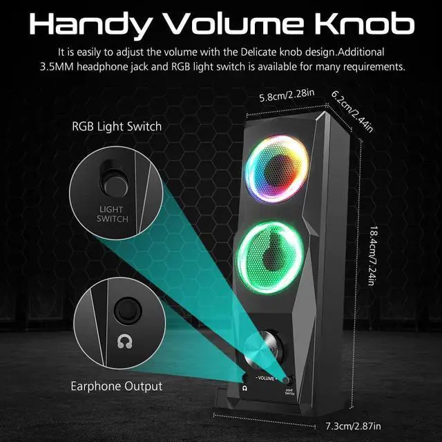 Handy Volume Knob& 3.5 mm Headphone Jack- With the delicate and compact volume knob, you can easily and precisely control the volume of the speakers for PC. The speakers also offer a 3.5 mm Headphone Jack for you to connect your headset or earphone.