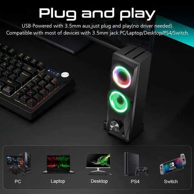 Plug and Play-USB powered and 3.5 mm audio cables, the gaming speakers are suitable for any device with a standard 3.5 mm headphone jack. BENGOO RGB PC speakers are ideal for the tablet, desktop laptop PC Mp3 player cellphone.