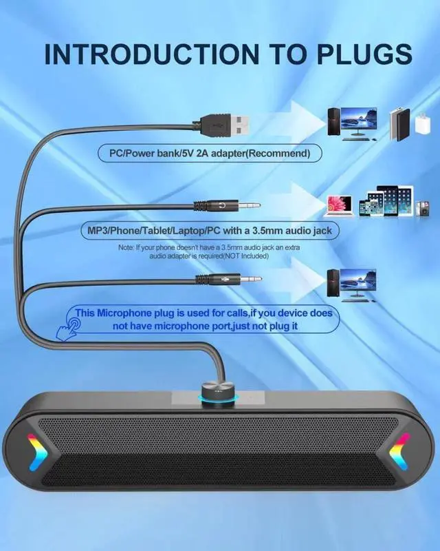 Computers: LENRUE A39PRO Computer speakers can work with any device that has a standard 3.5 mm headphone jack such as PC, laptops, tablets. The desktop speaker comes with 3.5 mm AUX Headphone Plug and Jack, 3.5 AUX Microphone Plug and Jack, so you can connect your wired headphones to the speaker for private gaming, music and movie time.