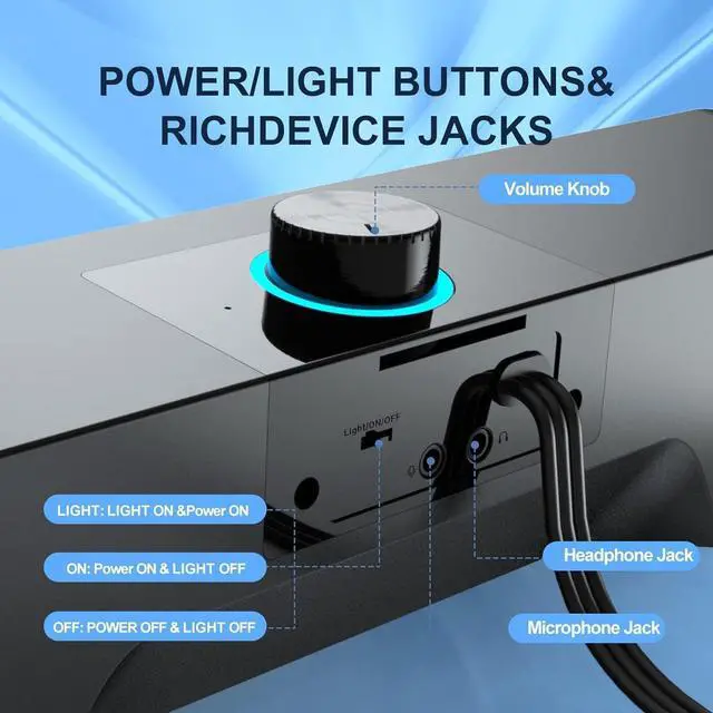 Colorful Breathlight Design: RGB colorful LED light is perfect for your homes, offices and workspaces to enhanced happy atmosphere. You can turn on/off the LED light by the control button on the sound bar.