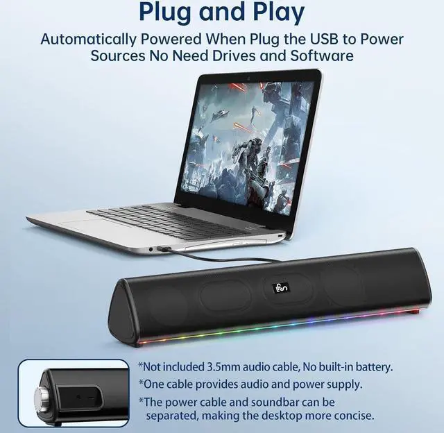 Plug & Play, Easy to UseLFS gaming monitor speakers do not require any extra software, just connect the USB plug into the USB side ports on your computers or laptops, go to system settings to select the device as the audio output, then it works properly.