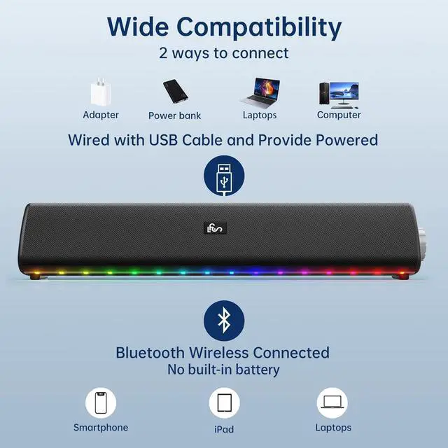 Bluetooth Wireless ConnectionLFS Bluetooth computer speakers supports Bluetooth 5.0 connection and is widely compatible with desktop computers, laptops, monitors, tablets, smartphones, smart TV, and other Bluetooth devices.