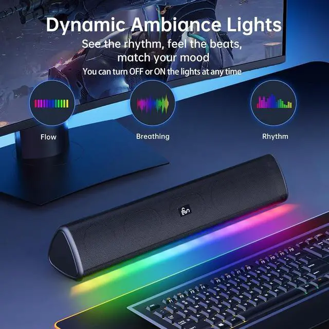 Colorful Ambiance LightsLFS computer gaming speakers supports three ambiance lighting effects including Flow, Breathing and Rhythm. Especially at night, feel the flow and breathing of the lights to the rhythm of the music, adding immersion to your movie or games.