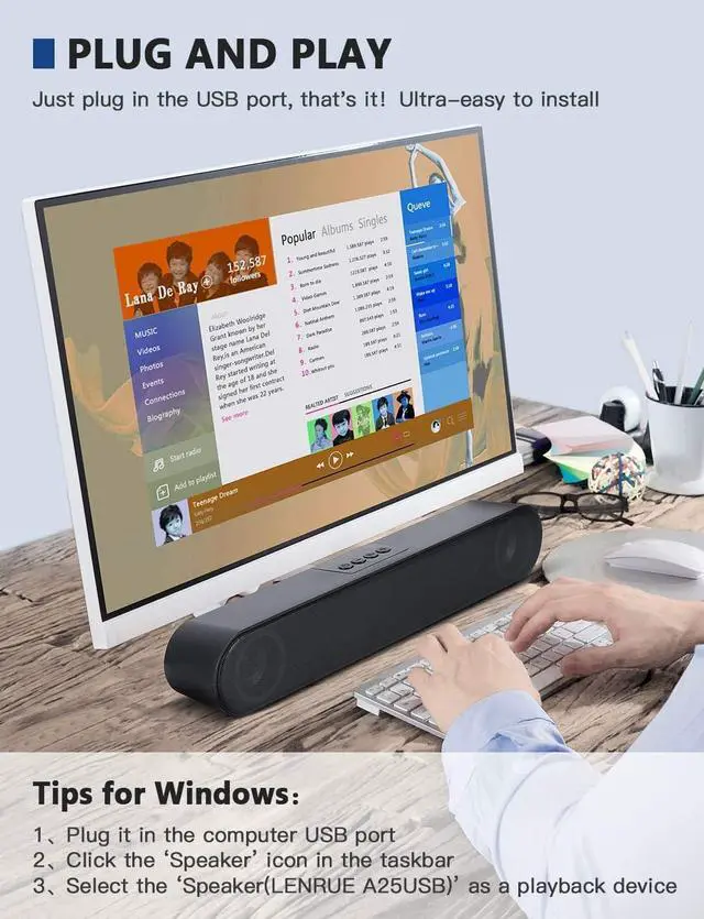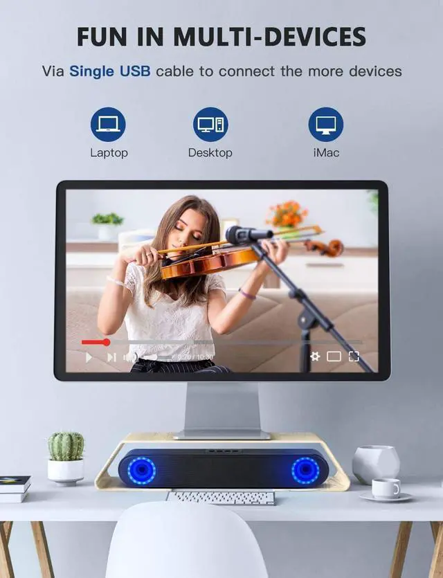 Compact & One CableThe PC speaker is compact in size and has only one USB cable, perfectly placed under the computer screen. Free up desk space, and reduce cable clutter. Bring more tidiness to your desktop.