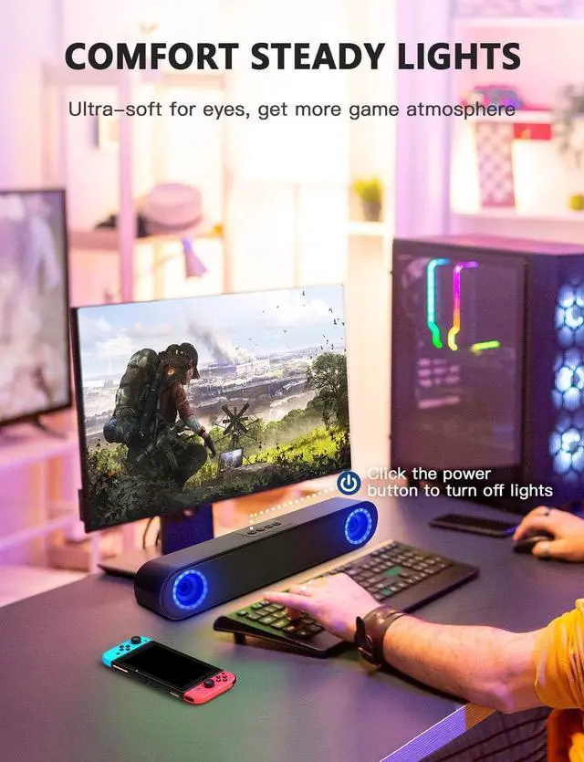 Comfort Lightlights of laptop speaker are soft and stable, brings you a comfortable experience. Click the power button to turn off the light to avoid disturbing your study and work.