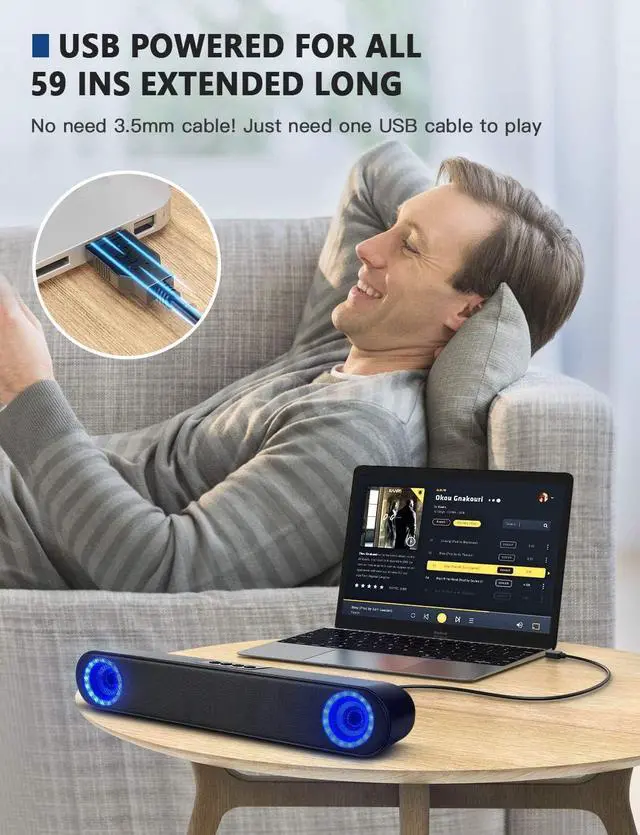 59ins USB Cable for Audio & PowerNo longer needed a 3.5 mm aux cable! The computer speaker upgrades the ultra-long One USB Cable for Both Audio & Power, avoid the wrong cable connection. Plug and play, very easy to use!