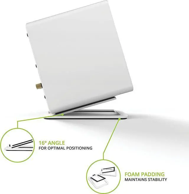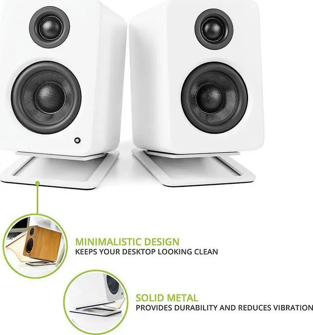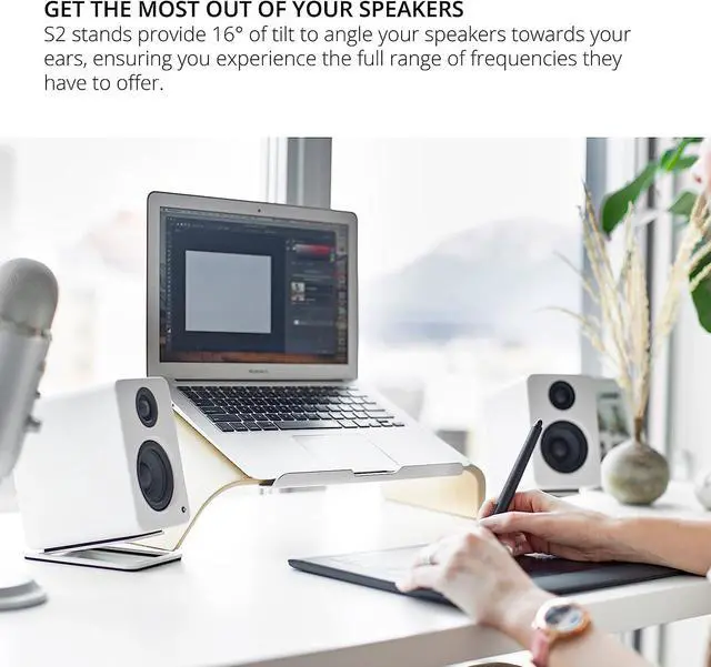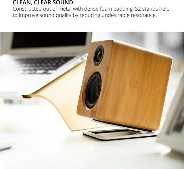 Low profile design for desktop speakers, ideal for YU2s 16° of vertical tilt Built out of solid aluminum with a painted finish Foam isolation pads to reduce vibration Measures 3.9 '' wide by 5.3 '' long and holds up to 6 lb per stand