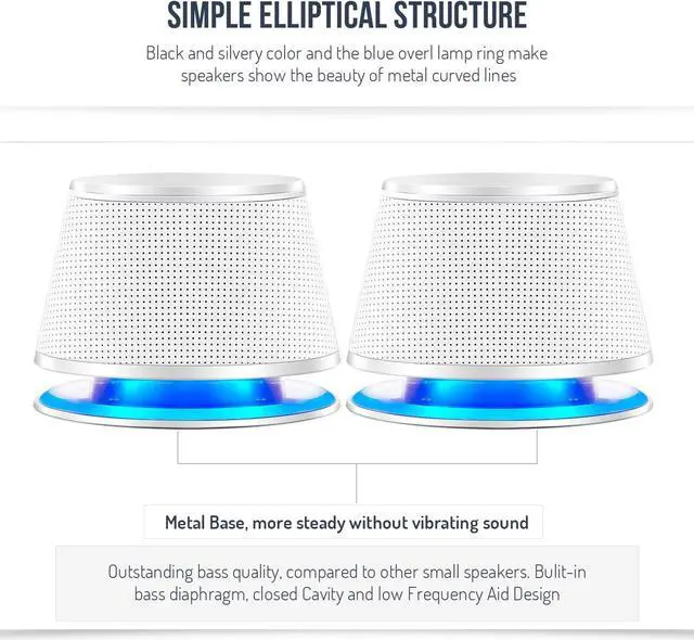 SIMPLE ELLIPTICAL STRUCTUREMetal and high quality plastics make it steady without vibrating sound. Black and silvery color and the blue oval lamp ring make speakers show the beauty of metal curved lines. Adopted the low-voltage digital power, the maximum power can be 5W x 2, ensure the sound clear, bright, rounded and thick. Small Body( 3.94 x 2.76. 2.95 inch) with powerful audio.