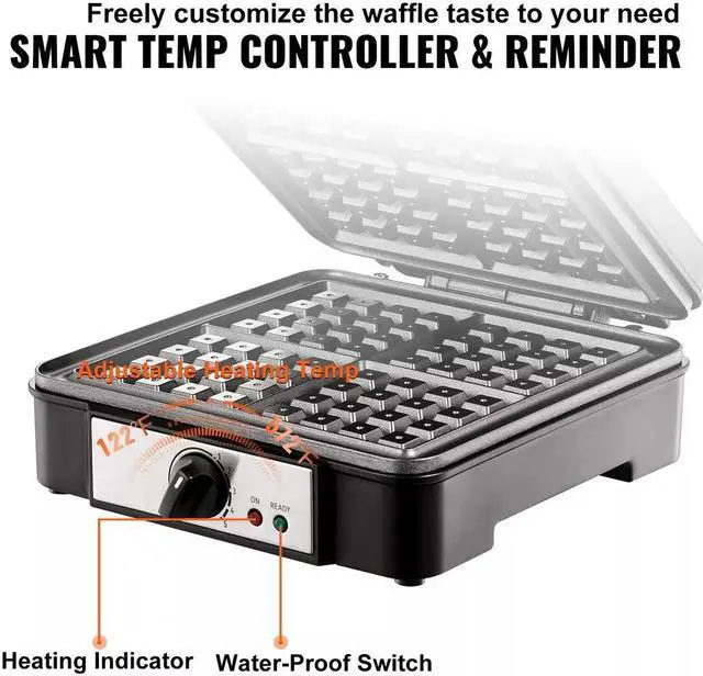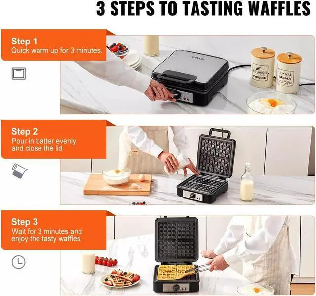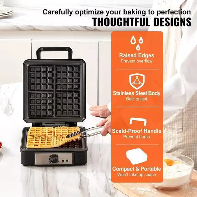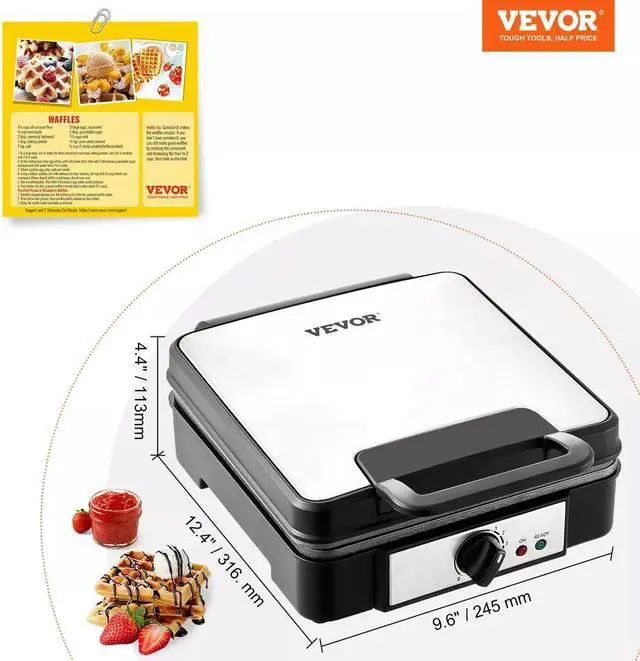 1. VEVOR's square waffle maker features a high power of 1200W, which can make 4 slices of 1-inch thick waffles at one time, satisfying your family's breakfast and making your morning more leisurely. Quick to customize your own signature waffles!
