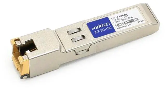 This Dell® SFP-1G-T compatible SFP transceiver provides 10/100/1000Base-TX throughput up to 100m over a copper connection using a RJ-45 connector. This TX module supports 10/100/1000Base auto-negotiation and can be configured to fit your needs. It is guaranteed to be 100% compatible with the equivalent Dell® transceiver. This easy to install hot swappable transceiver has been programmed uniquely serialized and data-traffic and application tested to ensure that it will initialize and perform identically. It is built to meet or exceed the specifications of Dell® as well as to comply with MSA (Multi-Source Agreement) standards to ensure seamless network integration.