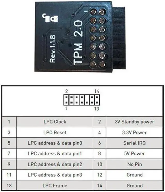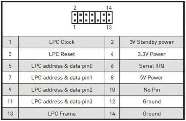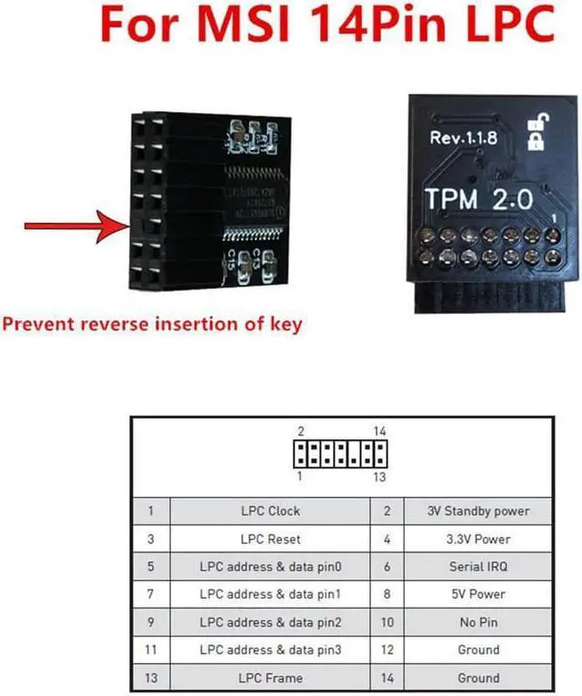 Package included: 1x TPM 2.0 Security Module for MSI 14PIN LPC Notice! The interface of this module is compatible with for MSI 14PIN LPC port definition as shown in the figure If you are not sure of the interface type, you can provide a model query.