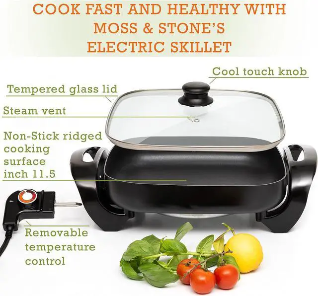 Special Housewarming Or Wedding Gift: Surprise your friends and relatives with the Moss & Stone professional-grade electric frying pan, which features an adjustable temperature controller from 200 to 425 degrees and a unique tilt leg that drains out the grease from your food as it cooks.