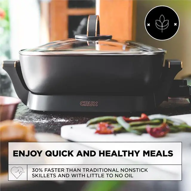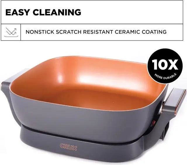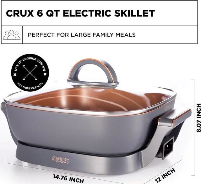 Deep Electric Skillet: Designed for even cooking with 3 extra depth for 50% more capacity, this 12" x 12" skillet has a 6 quart capacity & adjustable precision temperature control up to 400 degrees so you can do everything from deep fry to simmer