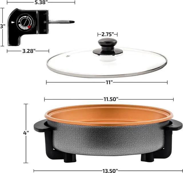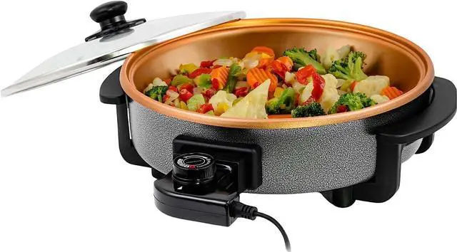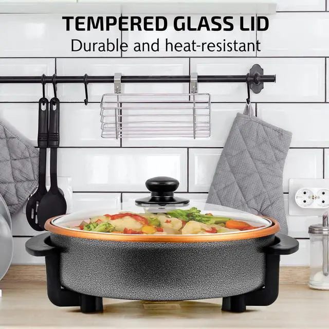 HASSLE-FREE COOKING Cook your way from breakfast to dinner and everything in between. This electric skillet with lid is powered by 1400-watts and made of high-quality aluminum body that conducts heat well for efficient, faster and better cooking.