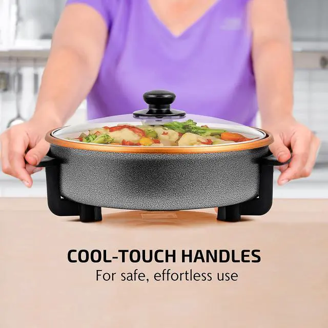 SPACIOUS The 12-inch size accommodates stew, sauce, and stir-fry meals. Our electric frying pan is versatile, perfect for cooking family favorites or trying new recipes like omelets, risottos, ratatouilles, paellas; the list is endless.