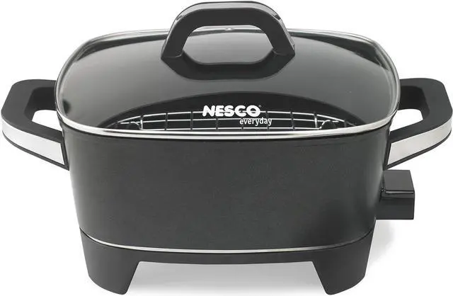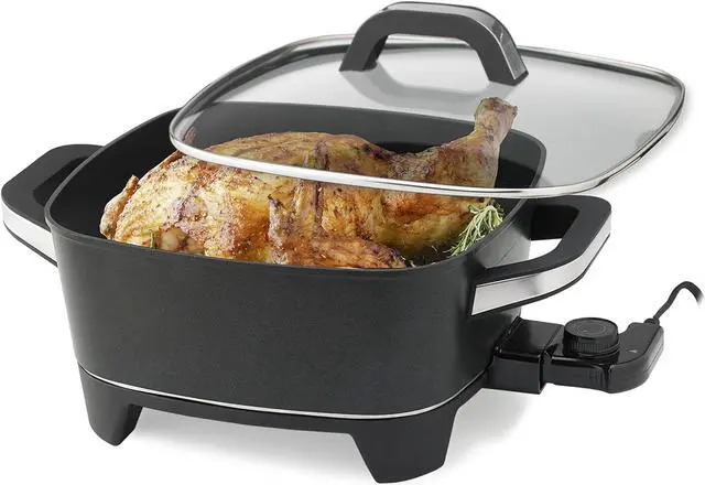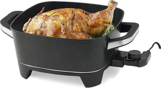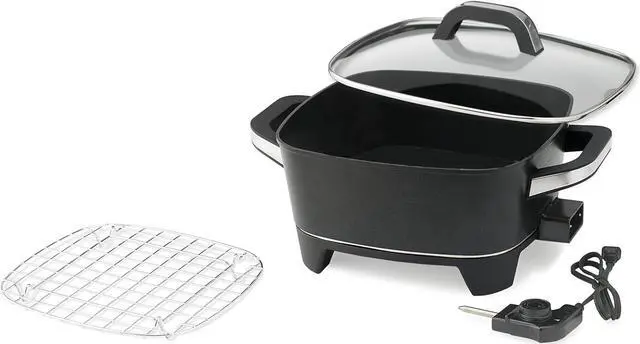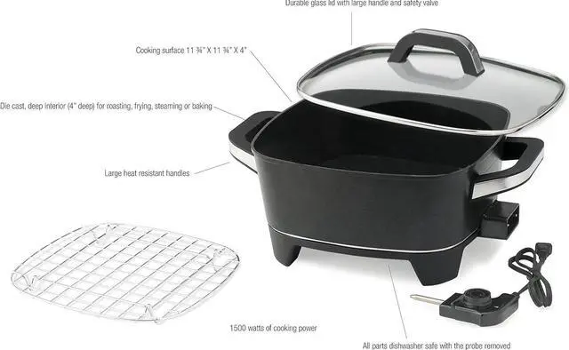 Die cast 4" deep skillet; 12"x12" cooking surface Easy to read adjustable temperature control Premium non-stick interior for easy cleaning Durable glass lid with large handle Heat resistant stay cool handles