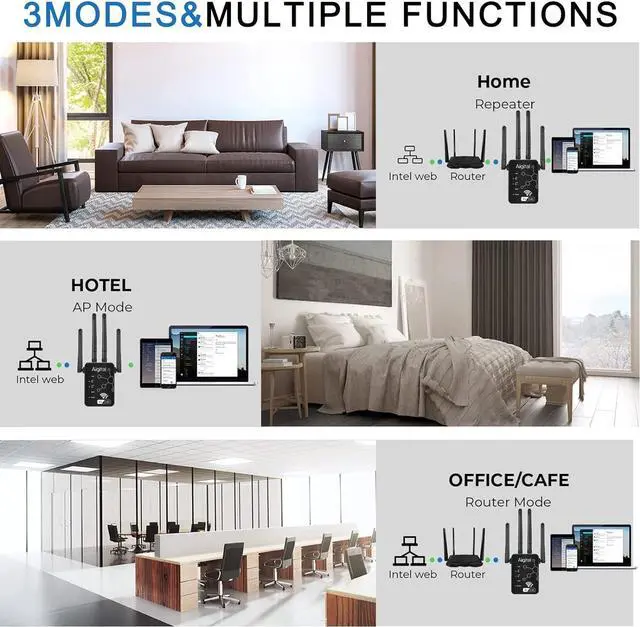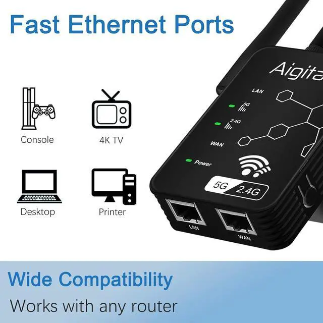 Access Point Mode & Ethernet Ports: The Ethernet port of wifi range extender can easily turn your wired Internet connection into a wireless access point. It can also function as a wireless adapter to connect wired devices, like Blu-ray player, game console or smart TV for maximum speed.