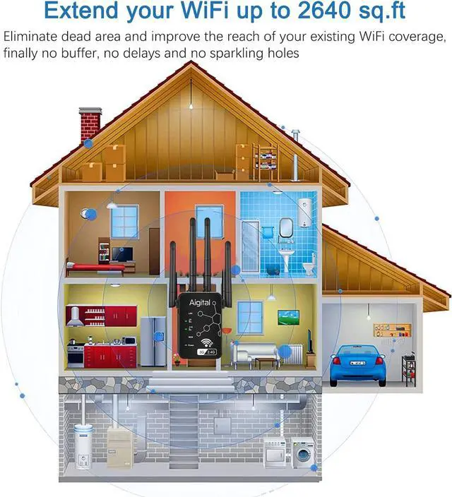 Say Goodbye to WiFi Dead Zone - Boost WiFi coverage up to 2, 640 sq. ft. and connect up to 35+ devices - with four adjustable external antennas, extending your wireless network to every corner of your house, allows you to receive stable signal in your bedroom, toilet, garden, garage, basement, etc.