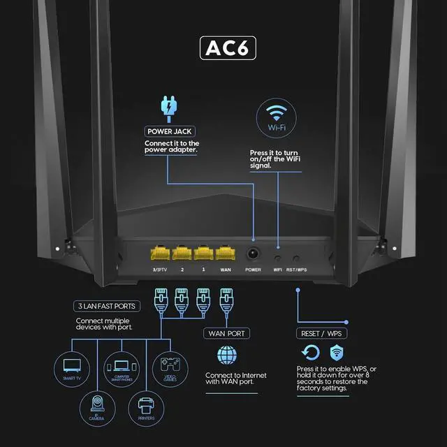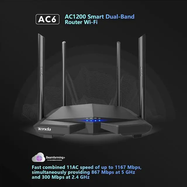 Antennas Maximum Signal Coverage: The Tenda Ac6 Is Equipped With Four Powerful 5Dbi Antennas, Delivering High Speed Internet Throughout Your Home And Provides Seamless Coverage For Up To 2000 Sq. Ft.